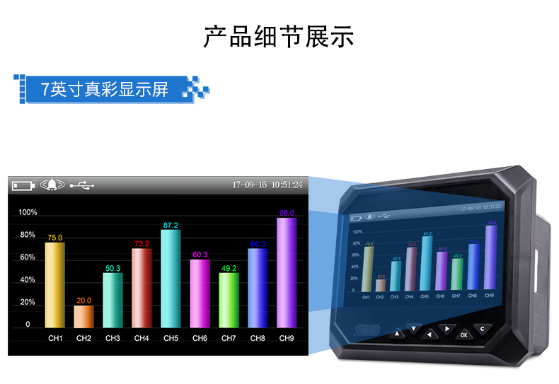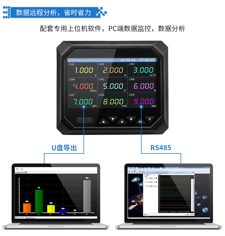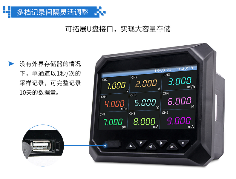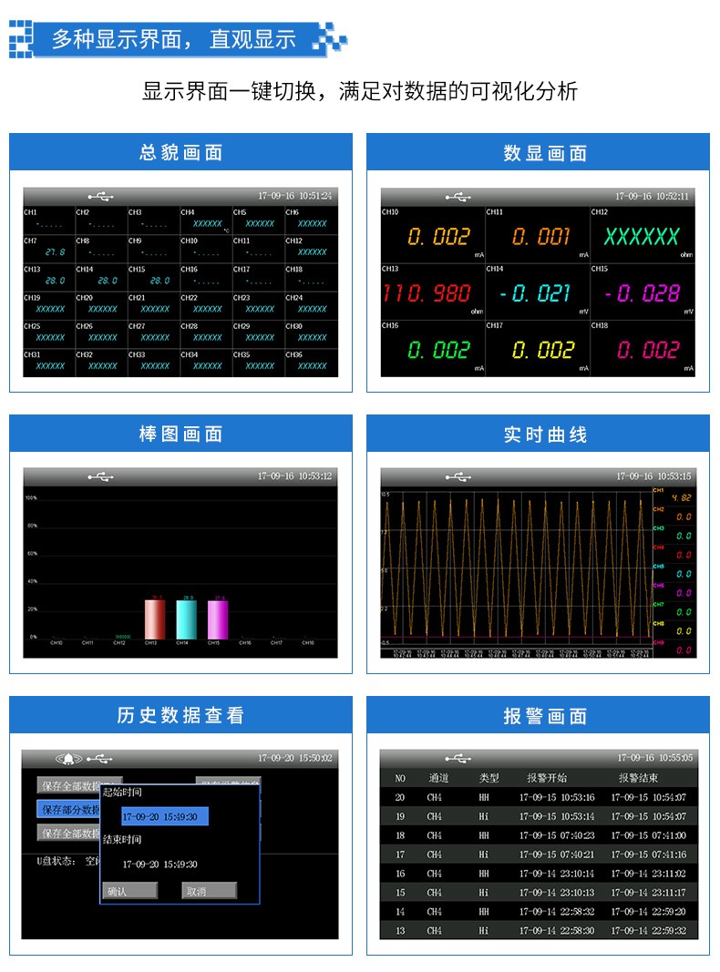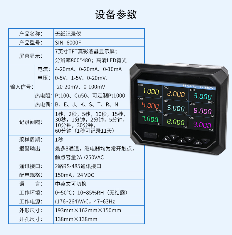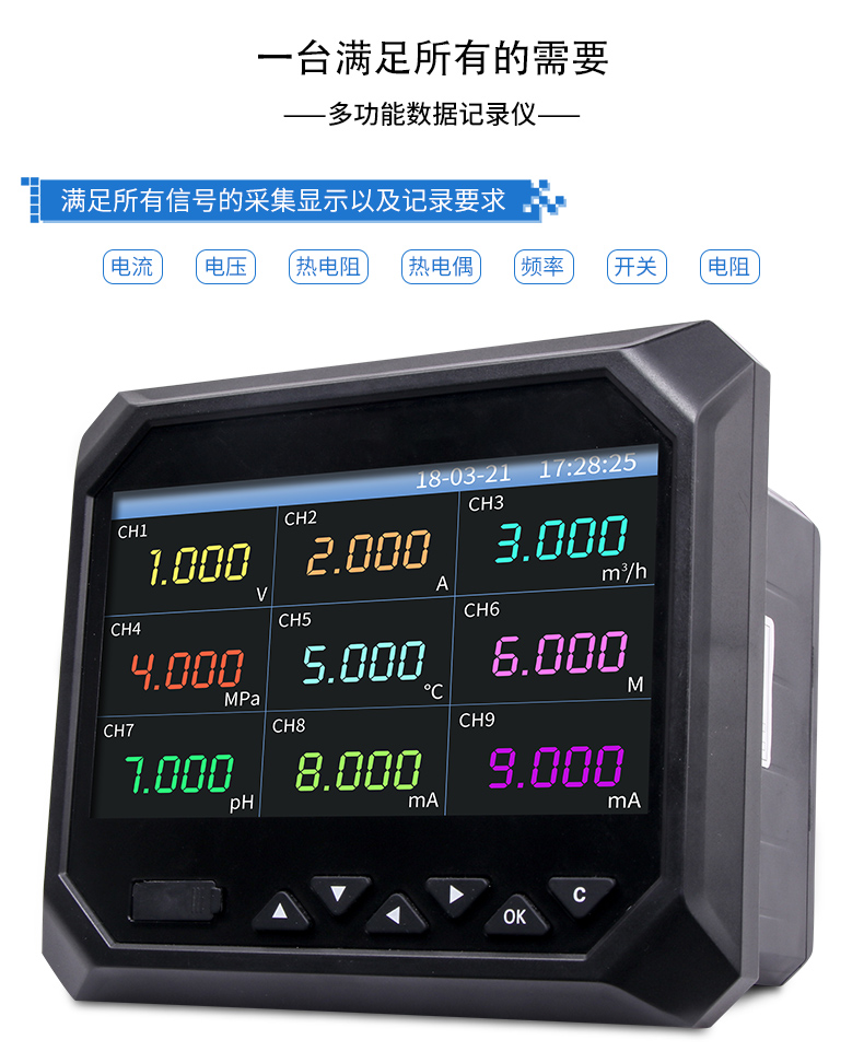 產品簡介:無紙記錄儀是將工業現場的各種需要監視記錄的輸入信號,比如熱電阻和熱電偶的溫度信號、流量計的流量信號、 壓力變送器的壓力信號等。通過高性能微處理器進行數據處理,一方面在高分辨液晶顯示屏幕上以多種形式的畫面顯 示出來,另一方面把這些監察信號的數據存放在儀表內部的大容量存儲芯片內,以便在儀表上直接進行數據和圖形查 詢、翻閱和打印。