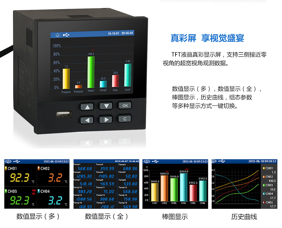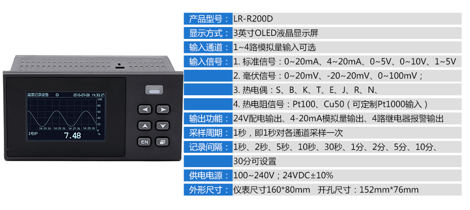 產品簡介:LR200D系列無紙記錄儀是一種高速高性能微處理器和3英寸單色液晶顯示分辨率320*200,對現場各種溫度、壓力、流量、電量等信號實現監測、控制和記錄功能。