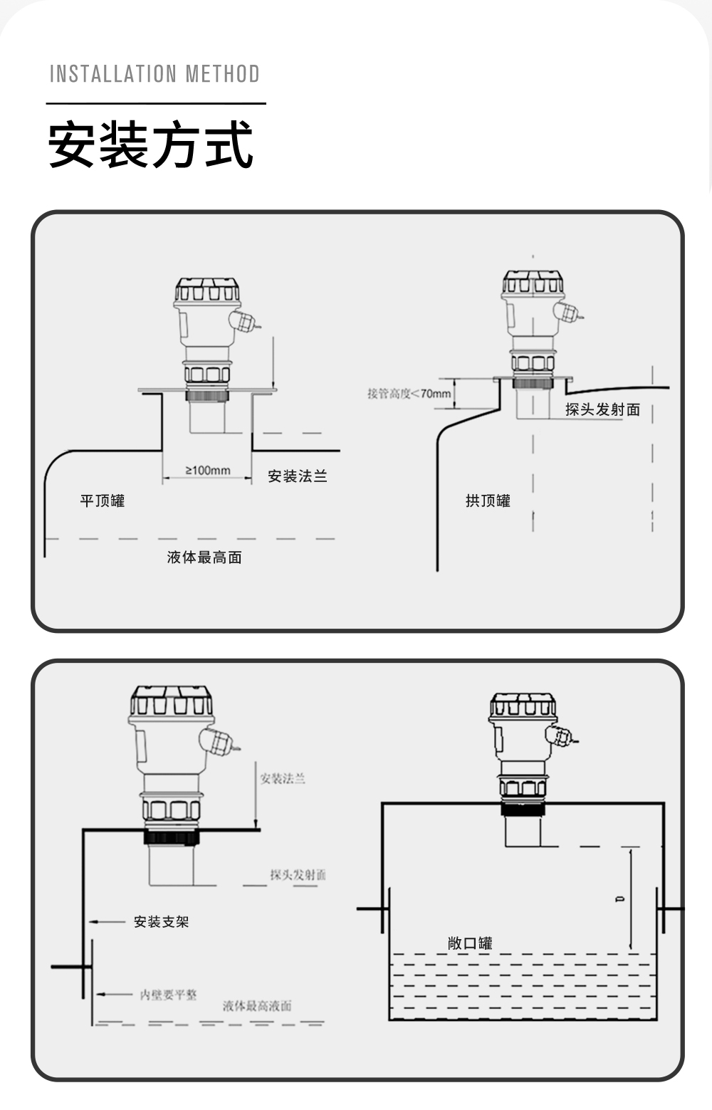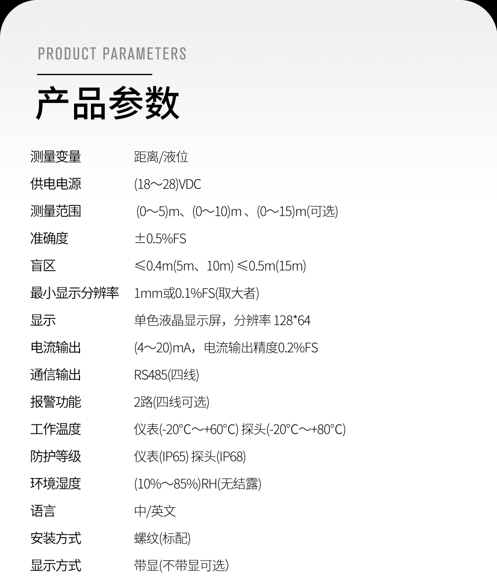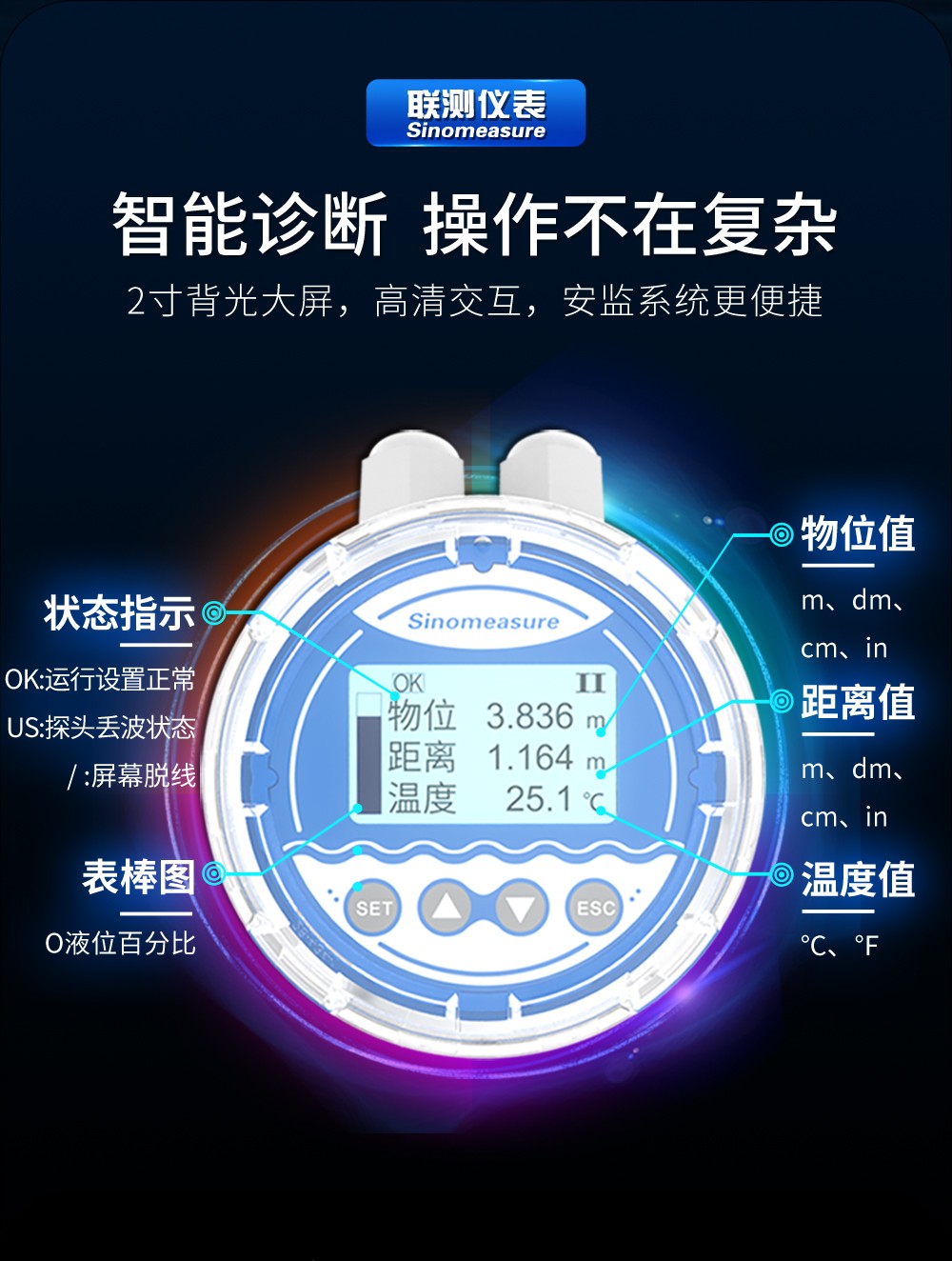 產品簡介:超聲波液位計(測量液位/物位),是一種非接觸式、高可靠性、高 性價比、易安裝維護的液位/物位測量儀器。它不需接觸被測量介質就能 滿足大部分液位/物位測量要求,是本公司具有完全自主產權的新一代超聲波液位計。