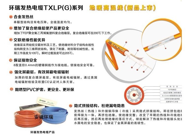 安徽環(huán)瑞提供的一種畜牧養(yǎng)殖幼崽專用發(fā)熱電纜,包括有發(fā)熱合金,所述的發(fā)熱合金外依次包覆有塑料導(dǎo)體、氟隆絕緣層、火焰及蒸汽交聯(lián)聚乙烯絕緣層、鍍錫紫銅絲接地、加厚型金屬電磁屏蔽層、阻燃型PVC外護套和彈性橡膠軟套,所述的發(fā)熱合金和塑料導(dǎo)體融為一體,防止電打火的情況發(fā)生。
