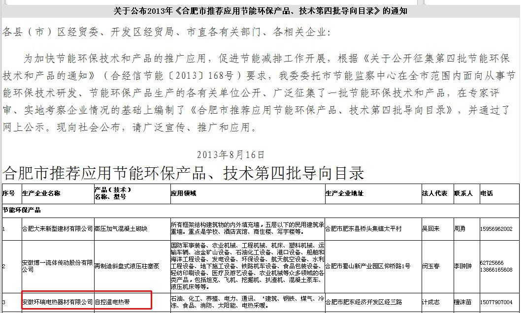 環(huán)瑞作為合肥經(jīng)濟(jì)科學(xué)建設(shè)道路上的重要成員,一直朝著“科技環(huán)瑞,電熱成就世界”的偉大藍(lán)圖邁進(jìn),其具有低電阻過渡層的自限溫電伴熱產(chǎn)品先后獲得省,市關(guān)于科技成果的榮譽(yù)有:合肥市科學(xué)技術(shù)獎(jiǎng),安徽省高新技術(shù)產(chǎn)品,合肥重點(diǎn)名牌產(chǎn)品。國家7項(xiàng)專利證書。其環(huán)保節(jié)能的特點(diǎn)已經(jīng)獲得政府、行業(yè)協(xié)會(huì),及市場的認(rèn)可。目前,環(huán)瑞公司已通過了合肥市推薦應(yīng)用節(jié)能環(huán)保產(chǎn)品、技術(shù)目錄的公示,獲得了環(huán)保節(jié)能產(chǎn)品稱號(hào),以下為合肥經(jīng)濟(jì)和貿(mào)易信息化委員會(huì)網(wǎng)站的公示內(nèi)容: