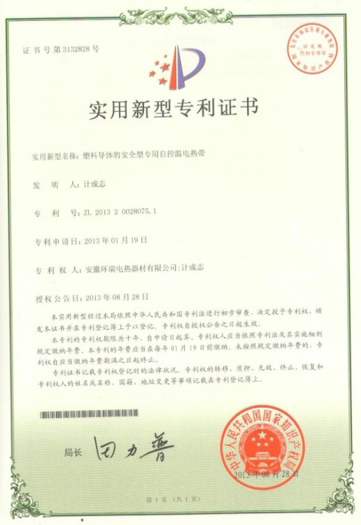 環(huán)瑞自成立研發(fā)小組至科學(xué)技術(shù)中心期間,通過獨立開發(fā),與合肥工業(yè)大學(xué)建立長期合作關(guān)系,聘請相關(guān)專業(yè)的技術(shù)專家等模式,投入大量的人力物力。我司以安全,實用性能為目標(biāo),對電伴熱帶結(jié)構(gòu)、原材料、生產(chǎn)工藝進行創(chuàng)新,最新研發(fā)的“三層共擠自控溫電伴熱帶”“ 塑料導(dǎo)體的安全型自控溫電熱帶”獲得了2項國家專利證書。我司已獲得了5項關(guān)于自限溫伴熱帶的國家專利證書,我司伴熱帶的生產(chǎn)技術(shù)已達到國內(nèi)先進。共計19項專利。新的專利證書已下達。
