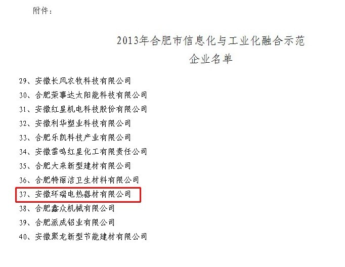 為加快推進我市兩化深度融合,發(fā)揮典型示范作用,依據(jù)《合肥市信息化與工業(yè)化融合示范企業(yè)認定管理辦法(試行)》和《合肥市第三方企業(yè)信息化公共服務平臺認定辦法(試行)》等文件,經(jīng)企業(yè)申報、縣區(qū)推薦、專家評審和綜合審查,現(xiàn)確定安徽環(huán)瑞電熱器材有限公司,等40家為2013年合肥市 安徽環(huán)瑞將積極響應政府的有關(guān)倡導:不斷提升自身信息化應用水平,切實發(fā)揮示范企業(yè)帶動作用,認真總結(jié)信息化建設經(jīng)驗,積極探索利用信息技術(shù)推動產(chǎn)業(yè)升級轉(zhuǎn)型,發(fā)展新型業(yè)務模式,培育新業(yè)態(tài),走出一條合肥特色的信息化與工業(yè)化深度融合的“科技環(huán)瑞”的發(fā)展道路,促進電伴熱帶,發(fā)熱電纜產(chǎn)業(yè)結(jié)構(gòu)優(yōu)化升級,最終為振奮合肥的經(jīng)濟,做出貢獻!