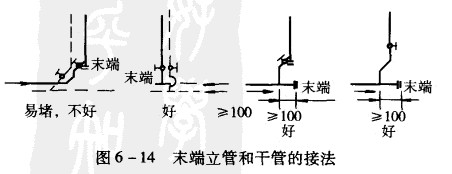 4.安裝時應(yīng)該注意末端立管和干管的接法,避免因泥砂堵塞造成最后一根立管上的加熱盤管堵塞,見圖6一14所示。
