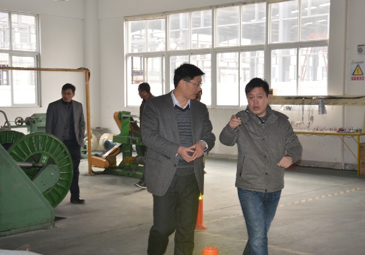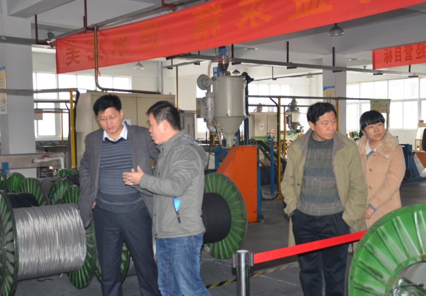 縣委孫書記、開發(fā)區(qū)領(lǐng)導仔細聆聽計總介紹關(guān)于我司自限溫電熱帶,恒功率電伴熱帶生產(chǎn)工藝流程