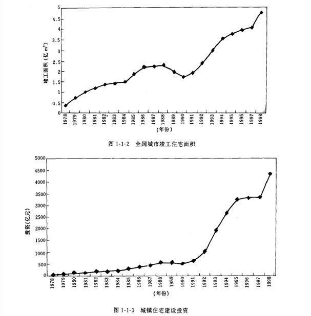 我國地域廣闊.人口眾多.房屋建筑規(guī)模巨大。其中住宅建設(shè)約占居住建筑的92%.而住宅,是世界各國都面臨的社會(huì)問題。“人人享有適當(dāng)?shù)淖》?rdquo;已成為聯(lián)合國第二次人居大會(huì)所提出的戰(zhàn)略目標(biāo)。改革開放以來.從1979年到1998年底.我國城鄉(xiāng)新建住宅建筑面積158億 ㎡其中城鎮(zhèn)住宅宅 約35億 ㎡.農(nóng)村作宅約123億MI.全國城市人均居住面積從3. 6 ㎡增加到9.3 ㎡(圖一1一1).竣 工面積從3 752萬 ㎡增加到47 600萬 ㎡(圖1-1-2).城鎮(zhèn)住宅建設(shè)投資從39.21億元增加到4 310.81億元(圖1-1 3). 1.7億戶遷入新居."八五"期間共完成城市住宅建設(shè)投資8 543億元.竣工 住宅10.5億 ㎡,僅1995年住宅竣工面積3.3億 ㎡.比“七五”期間增長76%.九五.期間計(jì)劃建設(shè) 住宅12億 ㎡,比“八五”期間增長14.3%.到1999年底。我國設(shè)城市加為668個(gè).當(dāng)年全國城市新 建房屋竣工面積4.362 5億㎡.其中住宅2.971 6億㎡.當(dāng)年底.全國住宅總使用面積為30.505 2億 ㎡.總居住面積為21.011 2億㎡.人均使用面積達(dá)到14.2 ㎡.人均居住面積達(dá)到9. 8 ㎡分別比上 年增長0.6和0. 5 ㎡.居民生活條件大有改善。住宅建設(shè)量大面廣.至今仍呈上升趨勢.而且這個(gè) 上升趨勢還將持續(xù)20-30年。由此看出,我國住宅建設(shè)正處于快速發(fā)展階段.不僅是中國歷史上的 最高峰.也是世界上任何一個(gè)國家所不可比擬的。