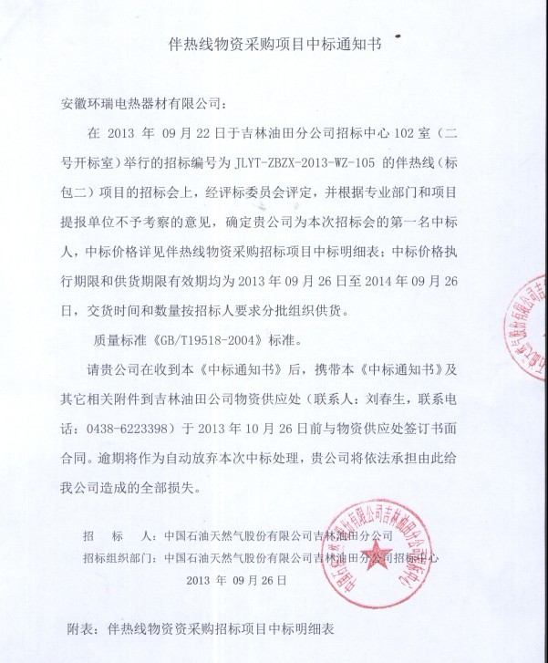 此次成功競標(biāo)吉林油田,也是甲方在去年使用過我司的電伴熱帶后做的慎重選擇,是對于我司電熱帶產(chǎn)品質(zhì)量的主要肯定。 本次項(xiàng)目包括自限溫、恒功率電熱帶兩大系列。目前正在緊張的進(jìn)行后續(xù)的項(xiàng)目合作中。以下為環(huán)瑞中標(biāo)通知書