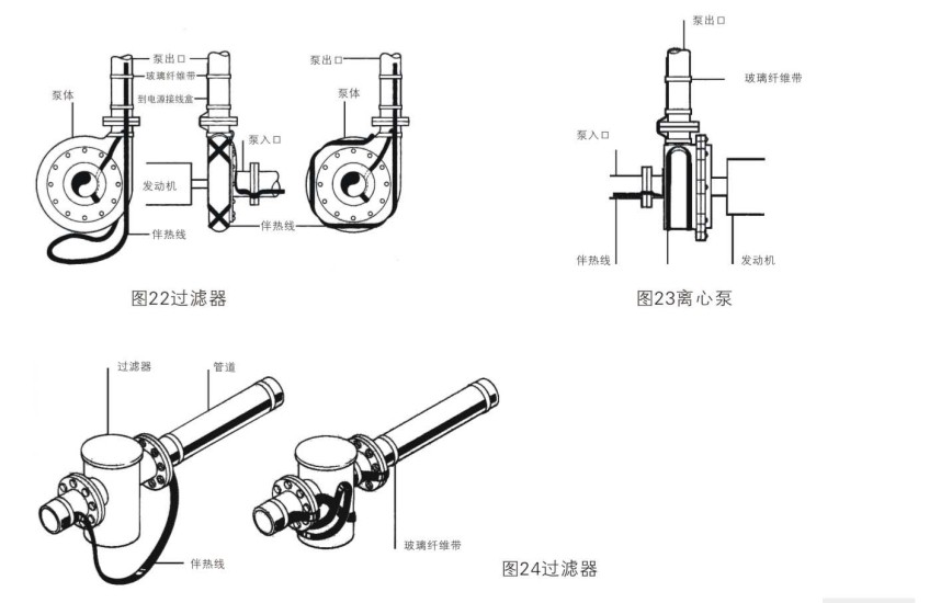 以上復(fù)雜管線電伴熱安裝前夕,需根據(jù)現(xiàn)場不同管徑,長度,計算熱損耗。確定電伴熱安裝比例與電伴熱帶米數(shù)(其中泵,過濾器,儀表等其他管道附件,需預(yù)留數(shù)量)。根據(jù)管道的配備相應(yīng)的電源接線盒,鋁箔膠帶,熱敏膠帶與不銹鋼帶等。其閥門,泵,過濾器,儀表電伴熱帶安裝圖列參照下圖。