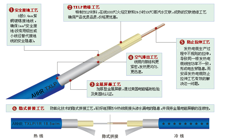 發(fā)熱電纜通電后,里面的鎳合金金屬組成的熱線發(fā)熱,并在40~60℃的低溫運(yùn)行,埋設(shè)在填充層內(nèi)的發(fā)熱電纜,將熱能通過(guò)熱傳導(dǎo)(對(duì)流)的方式和發(fā)出的8-13μm的遠(yuǎn)紅外線輻射方式傳給受熱體。