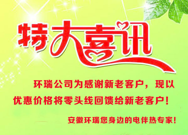 為感謝新老客戶對(duì)環(huán)瑞公司發(fā)展給予的支持,現(xiàn)有零頭線將以優(yōu)惠價(jià)回饋給新老客戶,歡迎廣大新老客戶咨詢訂購(gòu),環(huán)瑞十年專(zhuān)注電伴熱產(chǎn)品研發(fā),品質(zhì)保證。