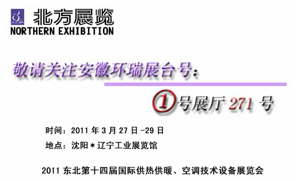 2011年3月27日-29日,安徽環(huán)瑞參加?xùn)|北國(guó)際供熱空調(diào)設(shè)備展覽會(huì)。屆時(shí),我們公司將展出公司的新型技術(shù)產(chǎn)品。希望廣大新老客戶(hù)來(lái)我展臺(tái)參觀(guān)洽詢(xún),我們的展會(huì)人員將以飽滿(mǎn)的情緒接待來(lái)至世界各地的每一位關(guān)注我們安徽環(huán)瑞的貴客。