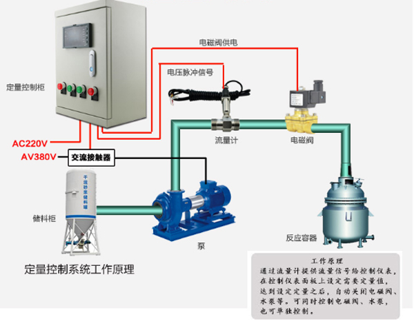 整個系統,定量計量開始時,定量控制儀指示電磁閥開啟,流體進入流量傳感器。一般的流量傳感器,工業上通常會選用脈沖輸出的渦輪流量計,以保證數據的響應速度,當然有些設備為保證精度會采用電磁流量計。流量傳感器將流量信號傳給定量控制儀并開始計量,當流量達到設定值時,定量控制儀發出指令使電磁閥、水泵等斷開(可同時控制電磁閥、水泵,也可單獨控制),恢復到初始的關閉狀態,從而實現了水量的定量控制。