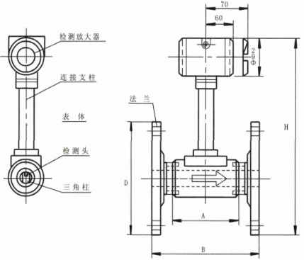 如圖1所示:渦街流量計(jì)由渦街發(fā)生體(三角柱)、檢測(cè)頭、表體、連接支柱、檢測(cè)放大器等組成。